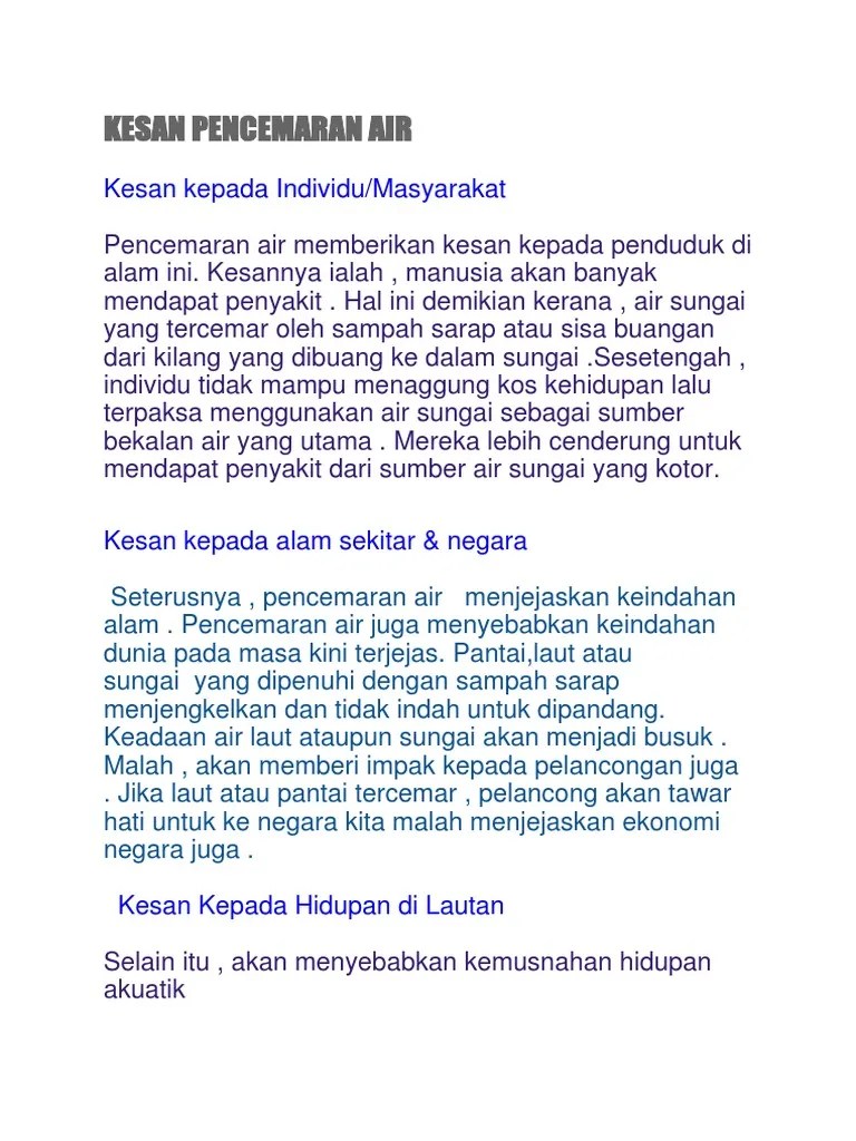 Pencemaran Alam Sekitar from image.slidesharecdn.com Alam sekitar yang sedang mengalami kemusnahan telah membawa banyak kemudaratan kepada manusia dan hidupan tidak kira hidupan di darat ataupun di air. Kesan pencemaran udara ke atas alam sekitar ekologi alam • kesan utama pencemaran udara adalah ke atas kesihatan manusia. Kesan kemusnahan alam sekitar ialah ekosistem dan ekologi alam semula jadi akan terganggu. Alam sekitar menyebabkan kemusnahan hutan kerana terkena hujan asid. Perkataan alam sekitar atau dalam bahasa inggeris disebut invironment membawa maksud terdapat satu lagi definsi alam sekitar. Kemusnahan alam sekitar diakibatkan oleh pelbagai pihak. Mala malays ysia ia,, akti aktivi viti ti. Topik kesan penerokaan sumber terhadap alam sekitar ini akan membincangkan 6 kesan negatif terhadap alam sekitar.