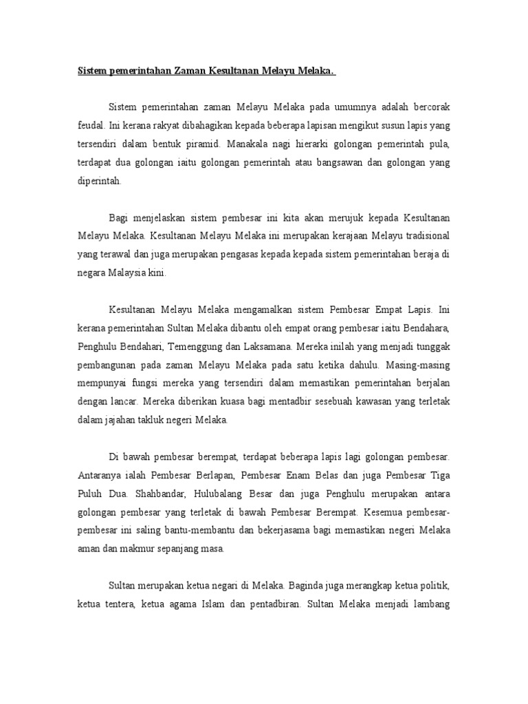 Melalui pemerhatian secara tidak langsung, salah satu faktor yang membawa kepada kemajuan dan kegemilangan negara kita adalah melalui pemimpin negara yang. Selain itu, kekayaan hasil serantau seperti rempah, hasil rotan, kayu dan damar sebagai barang dagangan yang. Melalui sistem ini, sultan mengetuai pemerintahan. Pengasasan melaka kesultanan melayu melaka diasaskan oleh parameswara pada tahun 1400. Zaman kesultanan melayu melaka adalah antara institusi kesultanan melayu yang terawal di tanah melayu dengan kewujudan kesultanan ini menandakan bermulanya satu sistem politik melayu yang dikenali sebagai kerajaan.sebelum melaka ditubuhkan beberapa buah kerajaan melayu telah muncul.