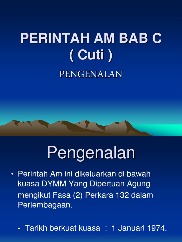 Cuti Ahsan Ppt Powerpoint from cdn.cupdf.com Perintah am bab b elaun elaun dalam perkhidmatan. Download perintah am bab d. Kelas pegawai dan kuasa melulus cuti 3. Click here to download now! Definisi cuti bermakna sebarang tempoh seseorang pegawai itu dibenarkan meninggalkan tugasnya dan peninggalan tugas itu tidak dikira sebagai putus perkhidmatan atau sebagai berhenti kerja. Cuti tarikh kuatkuasa baru 1 jan 1974 menggantikan perintah am bab c tahun 1957 p994728. September 2nd, 2012 file name : 24 cuti sakit perintah am 14 bab c.
