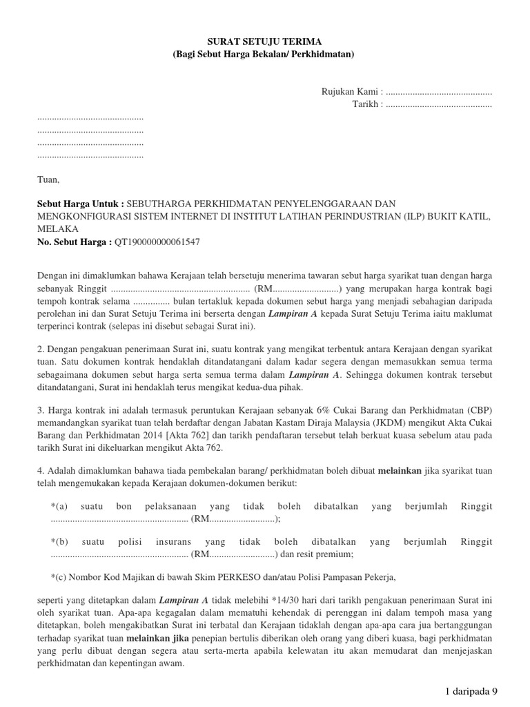 Surat setuju terima tender in english. Calon hanya boleh menjawab setuju/tidak setuju terima pelantikan sekali sahaja. Surat setuju terima tawaran pelantikan. Surat setuju terima tawaran pelantikan. Sekiranya calon menerima tawaran pelantikan, calon hendaklah mencetak dua (2) salinan surat setuju terima untuk dibawa semasa melaporkan diri di kementerian/ jabatan yang berkenaan.